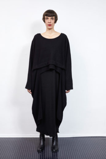 This oversized cut coat with weltpockets and a belt is made of black wool with a fine viscose lining